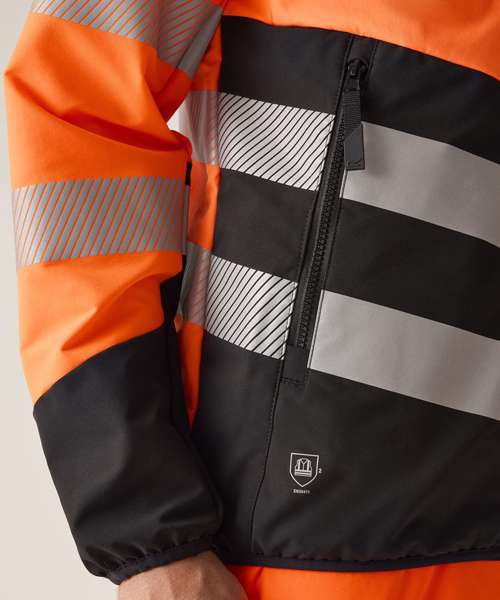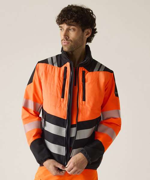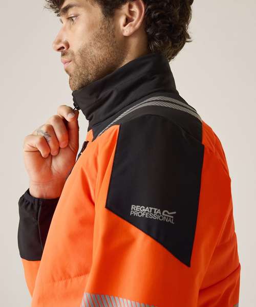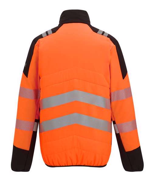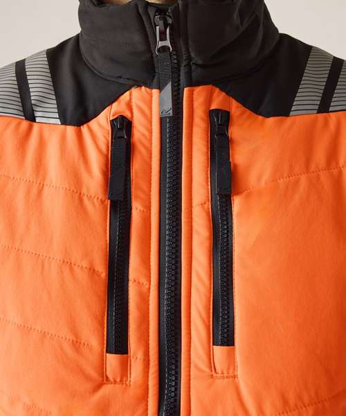 Lightweight four-way stretch fabric with durable water-repellent finish. Mechanical stretch softshell on sleeves and side panels for improved fit and freedom of movement. Warmloft Insulation on chest and back. Certified to EN ISO 20471:2013 A1:2016 Class 2. Orange colourway also certified to RIS-3279-TOM. Heat-applied reflective tape with segmented tape on strategic panels for additional comfort. Two zipped lower pockets and two zipped chest pockets. One internal zipped chest pocket and one lower mesh pocket. Centre front zip with inner chin guard. ID reflection – angled chevrons indicate which way the wearer is facing: towards or away.